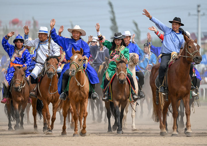 2024年8月18日,在第25屆8·18哲里木賽馬節開幕式上,通遼市各旗縣市區牧民代表騎馬入場。