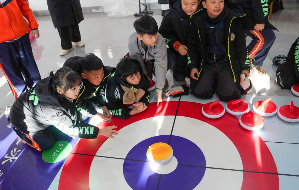 12月3日,吉林市松江東路小學校學生在吉林市納美山谷度假區體驗旱地冰壺。新華社記者 顏麟蘊 攝